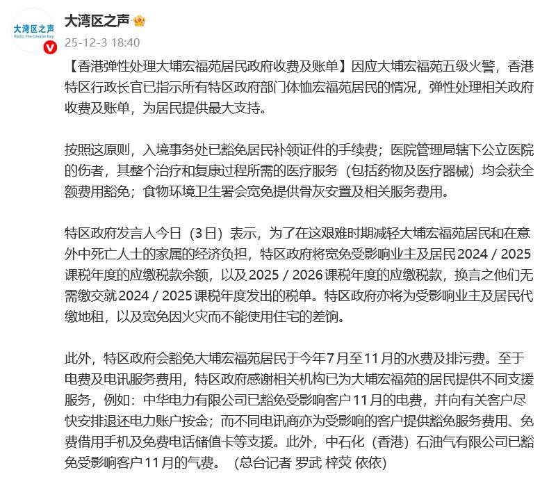 12月3日,@大湾区之声:因应大埔宏福苑五级火警,香港特区行政主座已指示总共特区政府部门体贴宏福苑住户的情况,弹性处理联系政府收费及账单,为住户提供最大缓助。