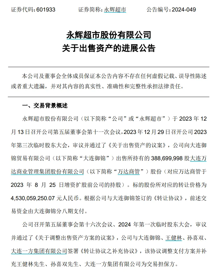 10月10日晚间,永辉超市(601933)发布公告,公司先前向大连御锦贸易有限公司(以下简称大连御锦)出售了抓有的万达商管股份,转让价款为约45.3亿元,由大连御锦分八期支付。但是,购买方大连御锦未按商定在2024年9月30日前支付第四期股权转让款3亿元,已组成毁约。