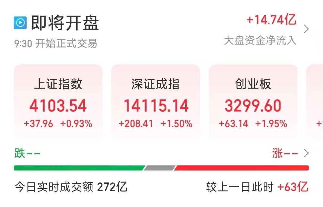 【大河财立方讯息】2月9日,A股三大指数集体高开,沪指涨0.93%,站上4100点,深证成指涨1.50%,创业板指涨1.95%。短剧游戏、Kimi、汉文语料库、杜撰东谈主、天际光伏等热点看法股涨幅居前,沪深北三市超4800只个股高涨。